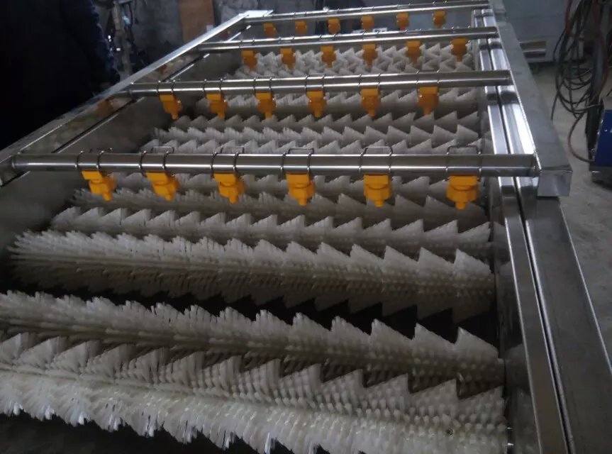 d:凈菜加工設(shè)備-毛刷清洗機(jī)是通過毛輥的轉(zhuǎn)動(dòng),把水果上面的泥土清洗干凈,不損害表皮,使水果表面光潔如新。例如:草莓、梨、桃、土豆、枸杞等球狀的水果。